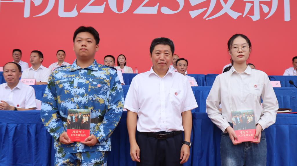 升旗仪式后,全体新生起立佩戴校徽。党委书记张方胜为本科生新生代表经济与管理学院郭義龙同学、研究生新生代表机械研究生黄静文同学佩戴湖北理工学院校徽,并赠送书籍,寄予新生殷切期望。各教学院新生代表向班导师代表献花,班导师为新生代表回赠书籍,温馨的互动传递着湖理师生间的传承与关怀。
