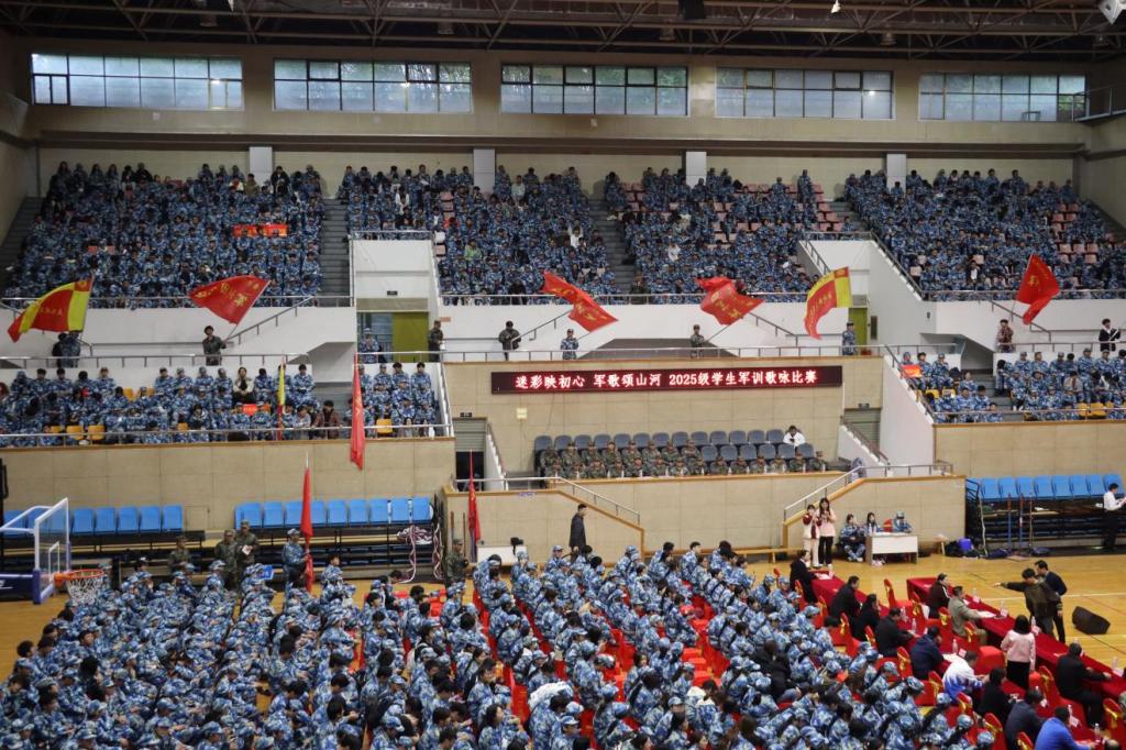 本网消息 11月6日下午,以“迷彩映初心,军歌颂山河”为主题的2025级新生军训歌咏比赛在我校东门体育馆举行。承训部队指导员姚攀、校党委书记张方胜、校党委副书记涂立桥出席活动,各职能部门负责人、各教学院党总支副书记、辅导员、在校生“教官团队”以及2025级全体新生共同参与。活动由校学工部、武装部主办,校“美工坊”辅导员工作室承办。