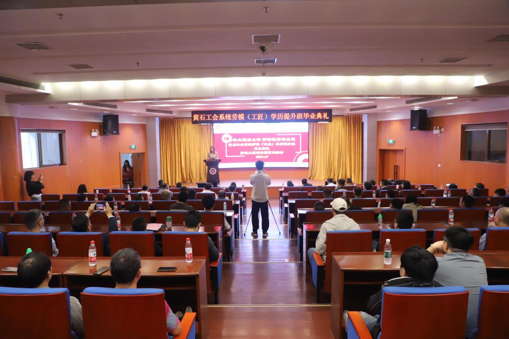 市总工会副主席杨自强致辞,肯定学员拼搏精神与校地合作成效,勉励大家以学促干、弘扬劳模精神,投身黄石高质量发展。