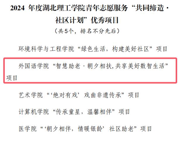 蒲公英志愿服务队获得多项荣誉:2022年11月荣获黄石市大学生暑期社会实践“先进集体”称号、2023至2024年连续两年荣获湖北理工学院“优秀志愿服务大队”,外国语学院荣获2024年度湖北理工学院大学生暑期“三下乡”社会实践活动“优秀组织奖”,学院“智慧助老•朝夕相扶,共享美好数智生活”项目荣获“共同缔造·社区计划”优秀项目。