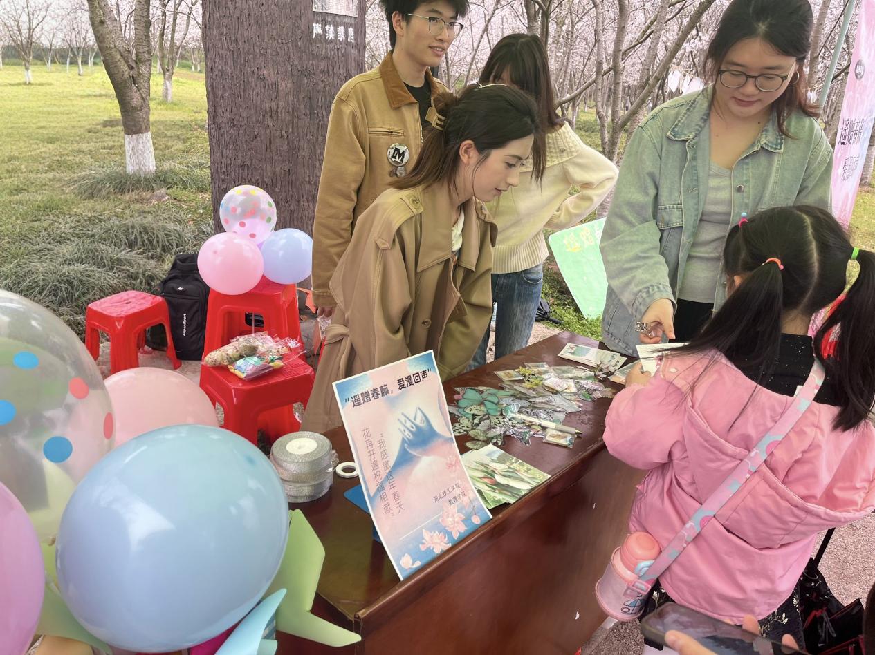 樱花树下的爱意回声墙,挂满了承载着深情厚谊的明信片,成为活动的一大亮点。第一位参与者是一位聋哑人。他的出现,让志愿者们立刻忙碌起来。由于沟通不便,志愿者便通过纸笔与他交流,在志愿者的引导下,他来到爱意回声墙前,接过纸笔,认真地写下“你们好!祝你们过日子,新春青未来。很美的花!”虽然语句不通,但这份跨越无声的美好祝福,格外动人,也为该环节拉开了温暖的序幕。明信片上,有对家人健康快乐的祝愿,质朴的文字间满是对亲情的眷恋;有学子们的美好期许,像“祝新的未来里平安,中考顺利。愿春花明亮、炽热,伴你成长”,是面临挑战的孩子们的美好期望……此外,诸如“你要叫醒颓废的自己”“山高路远,看世界,也找自己” 等充满诗意与力量的话语,也激励着人们不断前行。这些明信片吸引了众多路人停留,他们有的默默品读,有的拿出手机拍照记录,想要留存这份春日里的温暖与美好。