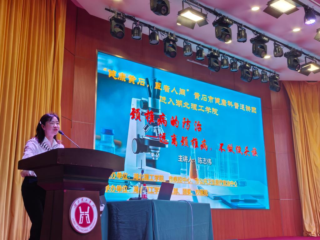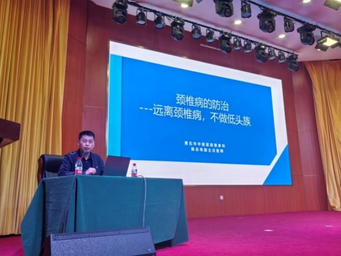 保护好颈椎,不做低头族。陈志伟是黄石市健康科普专家巡讲团成员,也是黄石市中医院推拿科主任,为大家作“健康黄石.医者人间”讲座。他以生动形象的图片画面开场,引出了现代生活中普遍存在的“低头族”现象,引起了师生们的共鸣。如长时间低头使用电子设备、不良的坐姿和生活习惯等一张张图片形象化导致颈椎病年轻化的主要原因、详细讲解了颈椎病的发病机制,从颈椎的生理结构出发,深入浅出地分析了颈椎间盘退变、颈椎骨质增生等病理变化如何压迫神经和血管,进而引发一系列症状,如颈部疼痛、僵硬、上肢麻木、头晕等。在预防方法上,讲解了很多实用的建议,如:保持正确的坐姿和站姿、定时进行颈部伸展运动、选择合适的枕头和办公桌椅等。为了让师生们更好地理解,团队成员亲自示范带领大家一起做颈椎操。