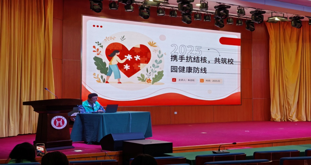 专家聚焦校园场景,详解结核防控要点活动。黄石市公共卫生医疗救治中心耐多药结核病区主任朱志松,他在结核病防治领域深耕多年,有着深厚的专业积累和丰富的临床经验。本次针对校园结核病流行特点作专题讲座。朱志松详细讲解了结核病的发病机理、临床症状、传播与危害、预防与控制、治疗及康复等方面内容。他用通俗易懂的语言剖析了结核菌如何在人体中引发病变,提醒师生们要时刻保持警惕。对于结核病的早期症状,进行了详细列举,如长期咳嗽、低热、乏力、盗汗等,以便师生们能够及时察觉身体异常,提醒大家做到早发现、早诊断、早治疗。在预防措施上,他特别针对校园环境给出了具体建议,强调了保持室内通风、加强体育锻炼、提高自身免疫力等常规方法,还要定期对公共区域进行消毒等。全会场师生们全神贯注,认真聆听,还有很多学生不时低头做着笔记。