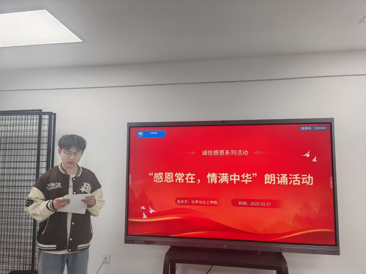 学院组织开展“感恩常在、情满中华”朗诵活动。化学与化工学院于3月27日在求实一站式学生社区102室举办“感恩常在,情满中华”朗诵比赛。同学们以饱满的热情和真挚的情感,通过朗诵的形式表达了对祖国、父母、师长和生活的感恩之情。一首《感恩常在,情满中华》的朗诵将对祖国的热爱、对民族团结的赞美以及对中华文化的自豪之情展现得淋漓尽致;一首《感恩父母,点亮生命的烛光》的朗诵,表达了对感恩父母日夜辛劳养育我们的感恩之情,让听众更加深切地感受到父母的爱;一首《恩师长歌》朗诵表达了对老师的感恩之情,感谢老师们的辛勤付出和默默陪伴。