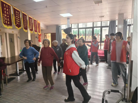 活动现场温馨融洽。志愿者们主动围坐在老人身边,亲切地与他们拉家常、话冷暖,耐心倾听老人们讲述过往经历与生活点滴,细致询问身体状况和日常起居,用陪伴驱散孤独,让老人们感受到家人般的温暖。为让老人们舒展身心、乐享运动,志愿者们提前精心编排了手部舞与健身操。动作舒缓易学,节奏轻快活泼,大家手把手教学、耐心示范,老人们兴致盎然地跟随节拍舞动,现场气氛热烈温馨。简单的手势与舒展的动作,既锻炼了身体,也拉近了彼此距离,展现出其乐融融的美好画面。