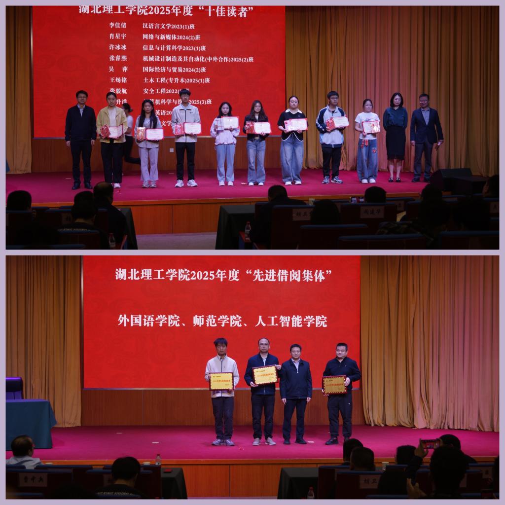 活动伊始,图书馆馆长钟松宣读了《关于表扬2025年度“先进借阅集体”“十佳读者”“优秀读者”的决定》。外国语学院、师范学院、人工智能学院荣获“先进借阅集体”称号;李佳倩、肖星宇等10名同学获评“十佳读者”;周依萍、罗文凯等50名同学获评“优秀读者”。与会领导分别为获奖集体和个人颁发了荣誉证书,充分肯定了他们过去一年在书香校园建设中发挥的模范带头作用。
