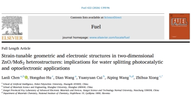 本网消息 近日,国际知名期刊Fuel在线发表了人工智能学院智能计算基础研究创新团队陈兰丽博士对ZnO/MoS2异质结物理机制研究工作。论文题目为“Strain-tunable geometric and electronic structures in two-dimensionalZnO/MoS2heterostructures:Implications for water splitting photocatalyticand optoelectronic applications”。陈兰丽博士为论文第一作者,湖北理工学院为第一单位,江西理工大学/江西科技师范大学熊志华教授为通讯作者。Fuel是ELSEVIER(爱思唯尔)出版社旗下工程技术领域著名期刊、SCI中国科学院大类二区TOP期刊,最新影响因子为7.5。